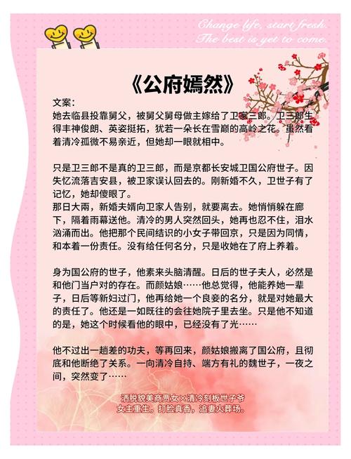 1、以下是一些与《嫁给极品太子》类似的温馨宠文推荐:《纨绔世子妃》:简介:这是一部非常受欢迎的温馨宠文。故事讲述了女主角云浅月与男主角容景之间的甜蜜爱情。容景身为世子,却对云浅月情有独钟,两人经历了种种波折后,最终走到了一起,过上了幸福美满的生活。文中的情感描写细腻入微,让人感受到满满的爱意与温馨。