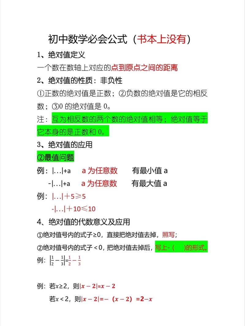 2、绝对值的性质主要包括以下几点:非负性:任何有理数的绝对值都是大于或等于0的数。即,对于任意有理数$x$,有$|x| geq 0$。零的绝对值是零:绝对值等于0的数只有一个,就是0。即,$|0| = 0$。绝对值相等对应相反数或相等数:绝对值等于同一个正数的数有两个,这两个数互为相反数。