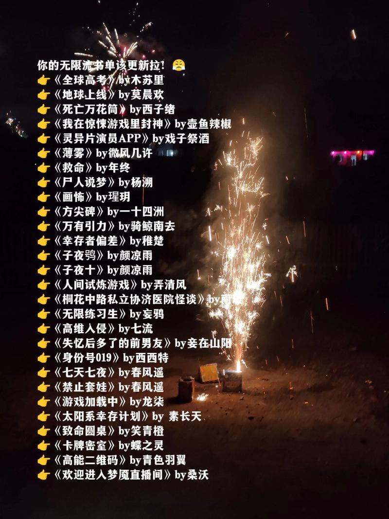 《无限恐怖》,作者是zhttty;《无限之淘汰》,作者是JustWe;《地狱公寓》,作者是黑色火种;《灾厄降临》,作者是黑十三郎;《恐慌沸腾》,作者是相思洗红豆;《边缘》,作者是无境界;《致命武力之新世界》,作者是实在没选择;《无尽武装》,作者是缘分0;《钢铁王座》,作者是咆哮的风月;《恶魔岛》,作者是流浪的蛤蟆。