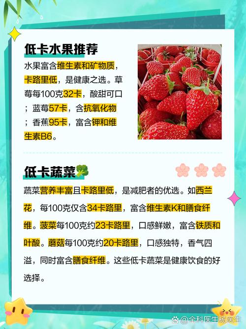 蔬菜是低卡路里的代表食物,富含维生素、矿物质和膳食纤维,且热量密度低。例如,生菜、菠菜、西兰花、胡萝卜等,每100克热量通常在20-50千卡之间,适合作为日常饮食的主要组成部分。水果同样以低卡路里和营养丰富著称,尤其是草莓、蓝莓、柚子、苹果等。