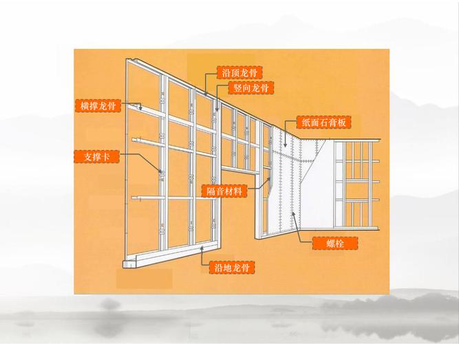 3、如嵌缝、贴接缝纸带、刮腻子等;并进行面层装饰,如喷涂涂料或贴壁纸等。轻钢龙骨隔墙具有重量轻、强度高、耐火性好等特点,同时具备隔音、防潮及抗震功能,广泛应用于办公楼、商场等新建及改造工程中。在施工过程中,应严格按照施工图纸和施工工艺进行操作,确保隔墙的质量和安全性。