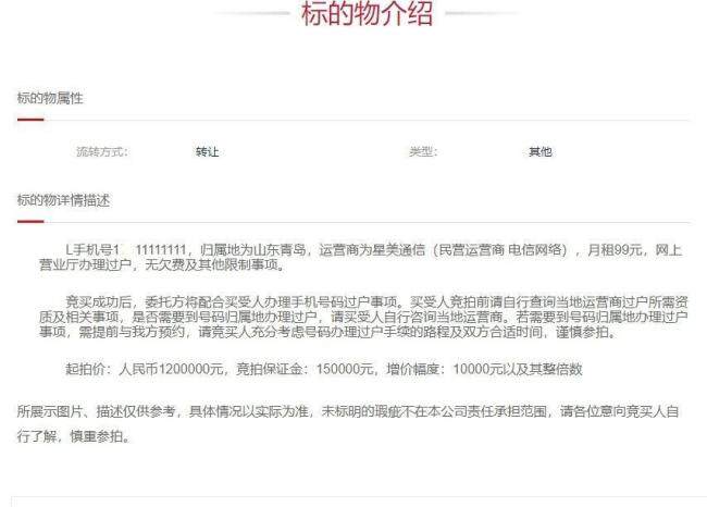 拍卖公告显示,该手机号的月租仅为99元,无欠费及其他限制事项。该手机号运营商为星美通信(民营运营商,使用电信网络),竞买成功后,委托方将配合买受人办理手机号码过户事项。参与竞拍者需提前交15万元的竞拍保证金,竞拍的增价幅度为1万元以及其整倍数。