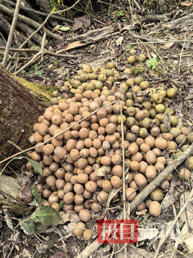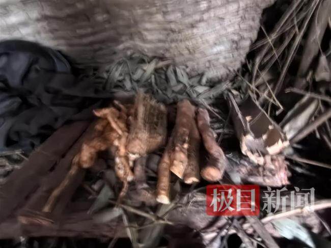 找到“苗王”时,他正关着门在自己的庇护所内烤火休息。记者开门进入,视线逐渐清晰,“苗王”坐在自己用木棍搭建的约1米宽的床上,面前烧着一堆火,温度适宜。地上和床头堆放着野生的猕猴桃、山梨、山药、葛根等食物。火堆上方还吊放着烤好的猕猴桃和山药,方便随时食用。庇护所的顶棚和后墙壁都是天然的石头,睡觉的床用木棍搭建,宽度只有约1米,右侧靠着石壁,左侧是火堆。