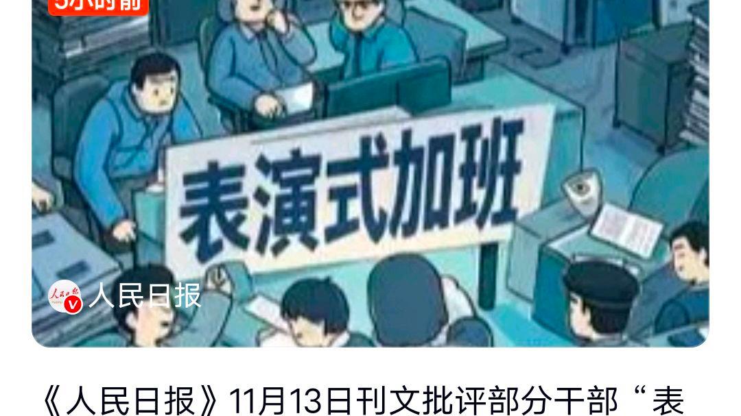 《人民日报》11月13日刊文批评部分干部“表演式忙碌”现象,指出其本质是形式主义,表现为朋友圈晒加班、“造景式调研”等虚假忙碌空耗行政资源,更消磨苦干者的干事热情、牵绊实干者的干事脚步。