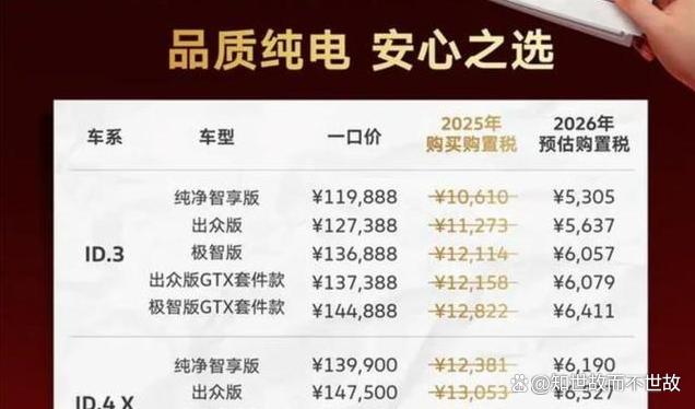 购置税调整对不同价位车型的影响差异巨大。以一辆12万元的电动车为例,目前购置税为0,2026年后需缴纳约5309元。