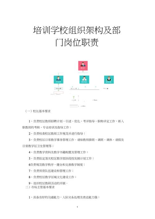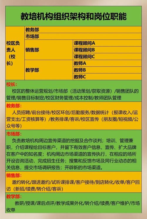 培训学校通常设有以下职位:校长,负责学校的整体运营和管理,制定学校的发展战略和目标。副校长,协助校长工作,分管教学、行政或财务等方面的具体事务。教务主任,负责课程安排、教师管理和教学质量监控。市场部经理,负责市场调研、品牌推广和招生宣传等工作。