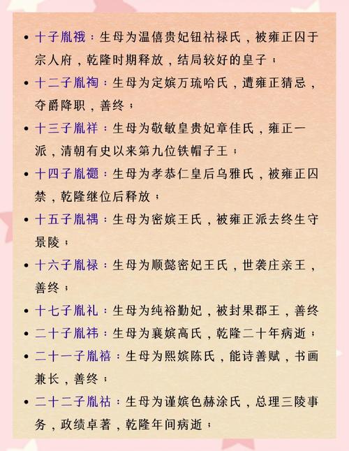 5、发配致死:被雍正帝发配至西北,在艰苦的环境中去世。十阿哥胤誐:发配圈禁:同样被雍正帝发配,后被圈禁,晚年生活凄凉。十三阿哥胤祥:备受重用:在皇位争夺中支持胤禛,雍正帝即位后备受重用,封为怡亲王,享有较高地位和待遇。