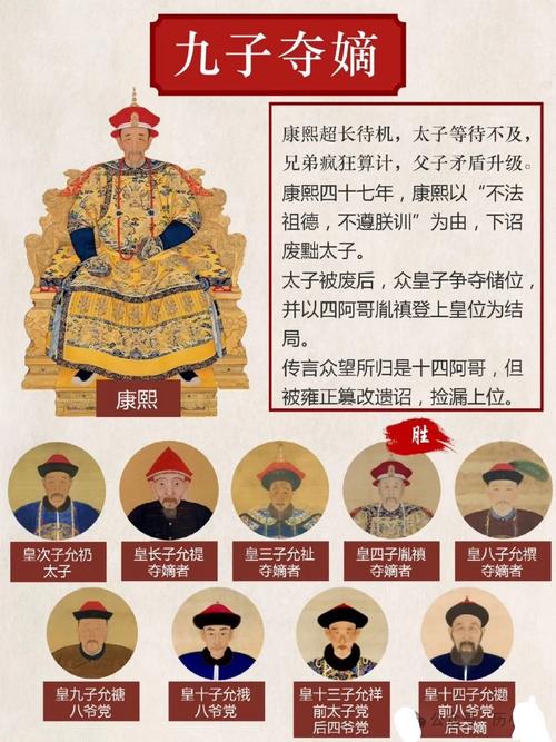 康熙二十四个儿子的结局如下:胤禛:成功继承皇位,成为清朝第五位皇帝,通过一系列政治改革和严厉手段巩固了自己的权力,实现了国家统一和社会稳定。胤礽:因多次谋反而被废为太子,后被软禁至死。胤祉:被封为和硕亲王,未参与皇位争夺,是一位学问渊博的学者,致力于文化事业和学术研究。