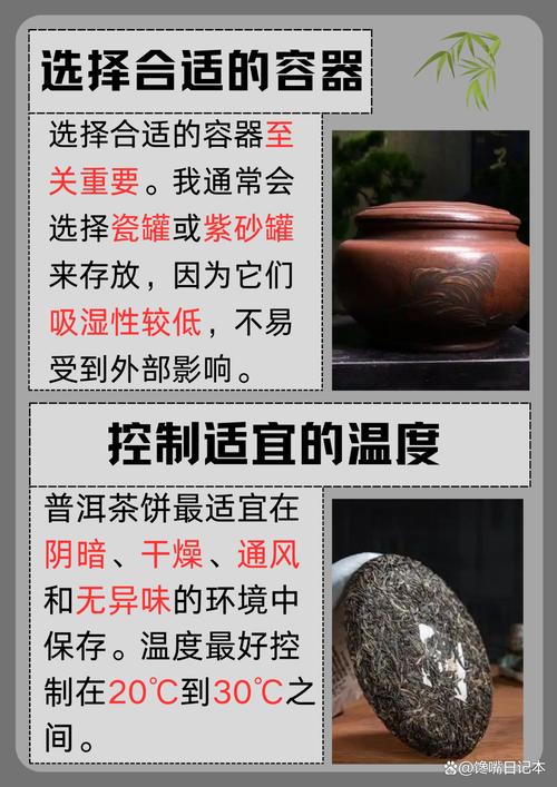 特殊保存法:竹笋壳子存放:专业的竹笋壳子是最佳的存储工具,能有效隔绝湿气和异味侵入茶叶。但此方法通常不适用于普通家庭。存放普洱茶饼的关键是避免潮湿和异味的影响,存储地点应远离地面和墙面,同时通风情况也需适中。遵循上述方法,即可为普洱茶饼提供一个理想的存放环境,确保其风味如初。