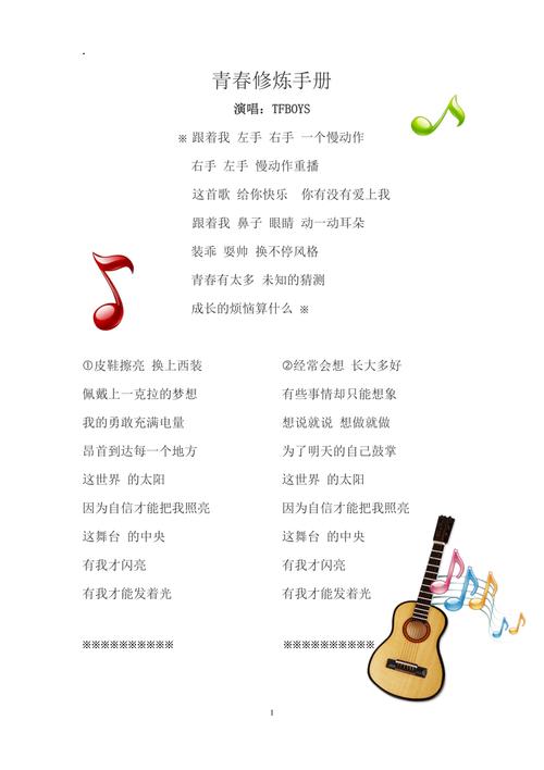 4、合: 跟着我鼻子眼睛 动一动耳朵 装乖 耍帅 换不停风格 青春有太多 未知的猜测 成长的烦恼算什么《青春修炼手册》鉴赏: TFBOYS演唱的《青春修炼手册》,旋律活力跳动,歌词朗朗上口,以调皮搞怪的音乐风格告诉粉丝,原来人见人爱的正太是这样修炼成长的。