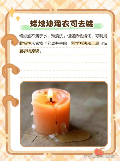 1、衣服上的蜡烛油清洗方法: 准备工作:首先,将衣服上已凝固的蜡烛油尽可能搓掉或用刀片轻轻刮去表面的蜡质。这样做有助于更快速且有效地清理油渍,同时避免损伤衣物。 水煮法:将染有蜡烛油的衣服部位先浸在开水中煮一下。这是因为油性物质需要通过加热才能更好地去除,单纯的热水洗涤是无法完全去除蜡烛油的。