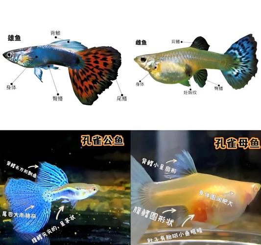 2、通常在一个月左右,可以通过观察它们肚子下面的鳍来分辨性别。公鱼的鳍尖锐,而母鱼的鳍则较为圆润。此外,公鱼的色彩变化通常会比母鱼早,母鱼的腹部后半部分则通常带有深色的胎斑。通过这些特征,可以轻松地分辨出孔雀鱼的性别。