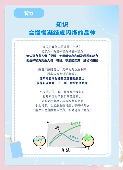 流体智力是指基本的心理过程能力,如快速反应、记忆、推理和理解复杂问题的能力;而晶体智力则是通过学习和经验获得的知识和技能。流体智力: 形象比喻:如同一个天生的智力工具箱或者一张白纸。每个人出生时都具备这种能力,但它更像是一种潜能,需要通过后天的开发和利用才能转化为实际的能力。