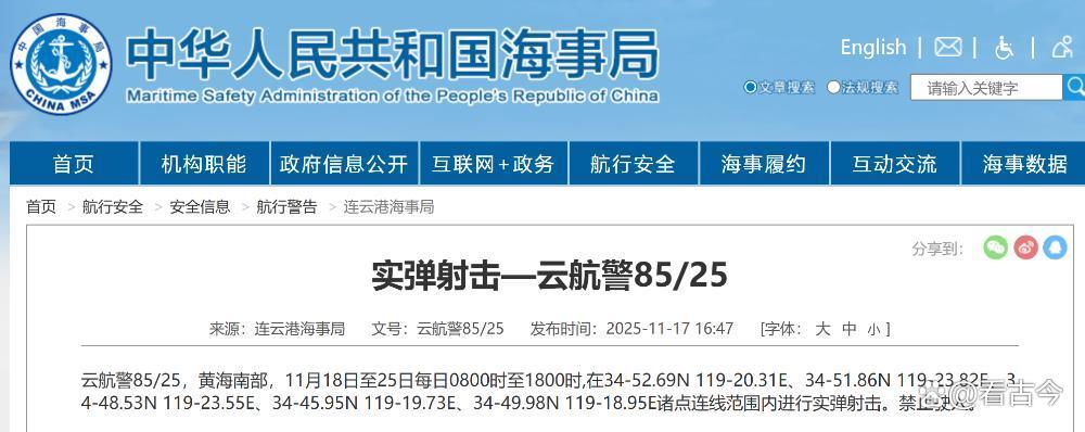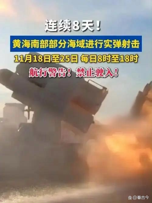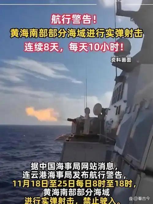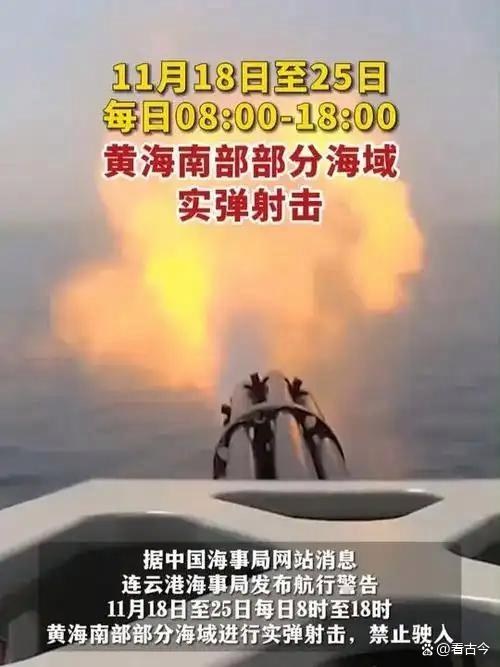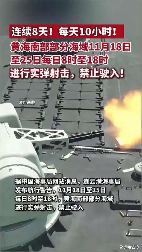 2025年11月18日至25日,咱们黄海南部要上演一场"真枪实弹"的年度大戏!每天上午8点准时开机,下午6点准时收工,这波操作比996还规律,堪称"海上打工人"的硬核日常。不过要提醒各位船老大,这片海域即将开启"请勿打扰"模式,否则你的爱船可能分分钟变身"移动靶标",这波血亏咱可担待不起!