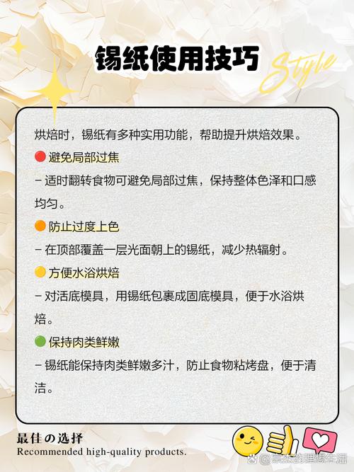 2、烤箱油纸可以用以下物品代替: 锡纸(铝箔纸):锡纸能够耐受高温,适用于油脂含量较高的烘焙食品。它不仅可以起到防粘的作用,在烘焙面包、饼干、蛋糕时,覆盖在食物上还能防止上色过重。 硅胶垫:硅胶垫是一种可重复使用的防粘工具,由耐高温的硅胶材料制成,具有出色的防粘效果。
