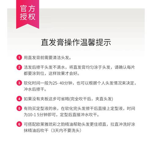 2、缺点 效果因人而异:不同人的头发质地、发质不同,对三合一免定型拉直产品的吸收和反应也会有所差异,可能导致效果参差不齐。例如,粗硬发质可能需要更长的时间或更多的药水才能达到理想的直发效果,而细软发质则可能更容易受到损伤。