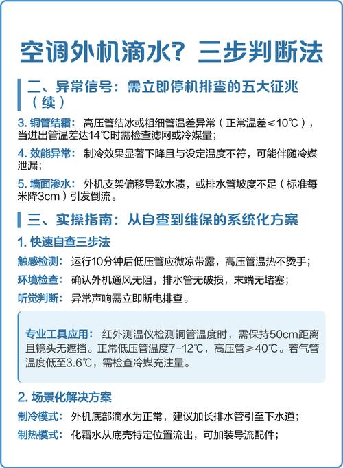 4、大部分情况下外机滴水是正常现象,但排水量过大或水流位置异常时需注意。比如外机安装倾斜导致水流向墙体,长期可能引发墙面腐蚀;排水管堵塞则可能倒灌进室内。建议定期清理外机周边落叶杂物,保持排水口畅通。