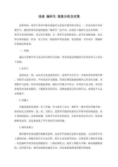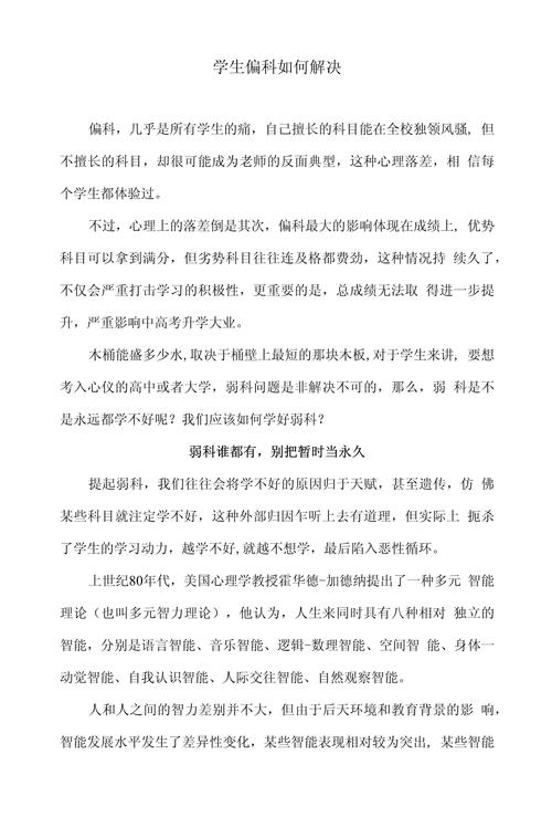 3、孩子学习偏科的原因及解决方法如下:偏科原因: 对该学科不感兴趣:孩子可能对某些学科缺乏兴趣,导致上课时走神,无法集中注意力。 基础知识薄弱:孩子在某些学科的基础知识积累不足,缺乏学习信心,进而影响后续学习。