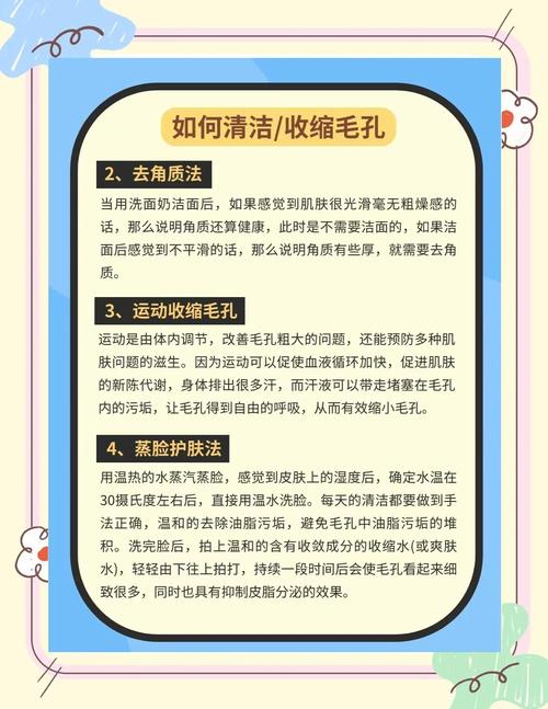 6、清理毛孔堵塞最快最有效的方法包括以下几点:用温水清洗脸部:利用热胀冷缩的原理,使用温水洗脸可以使毛孔扩张,从而更有效地清除毛孔内的垃圾。建议洗脸时间控制在3分钟左右。定期去角质:人体新陈代谢产生的死皮和多余角质容易堵塞毛孔。