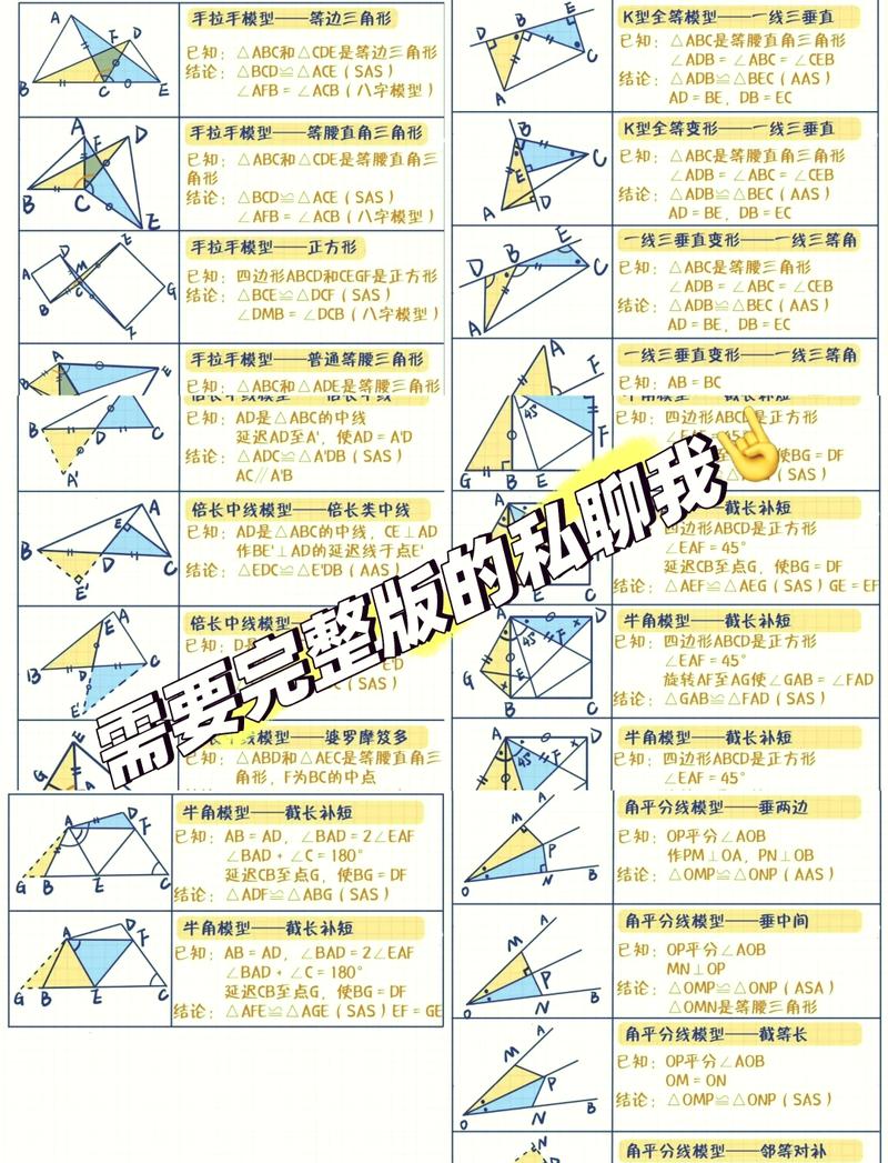 角角全等(AAS):如果两个三角形中有两个角分别相等,且这两个角所夹的边也相等,则这两个三角形全等。 直角三角形中的HL:在直角三角形中,如果一条直角边和斜边分别相等,则这两个直角三角形全等。这一判定方法也称为HL判定。