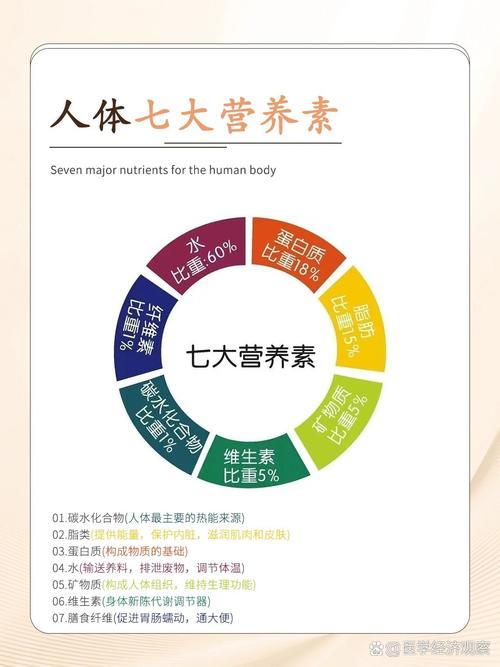 2、人体健康离不开七大营养素的支撑,它们分别是水、蛋白质、脂肪、维生素、纤维素、糖和矿物质。水是人体内含量最多的成分,约占体重的60%左右,对于维持体温、运输养分和排除废物至关重要。蛋白质是构成人体组织的基本物质,它参与身体细胞的构建和修复,也是酶和激素的重要组成部分。