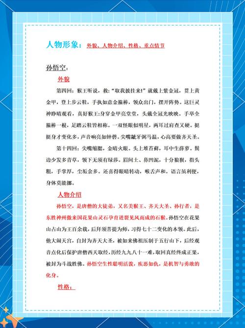 2、孙悟空,则是这部作品中最为引人注目的角色之一。他桀骜不驯,敢作敢当,富有反抗精神。他不仅有勇有谋,爱憎分明,疾恶如仇,而且好胜心强,喜欢捉弄人恶作剧。这些特点使得孙悟空在取经路上成为了唐僧的重要助手,也赢得了众多读者的喜爱。猪八戒的形象则显得更为复杂。
