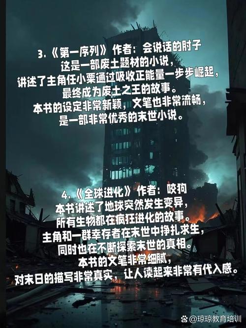 1、《废土》:这部小说堪称末日废土流小说的经典之作。黑天魔神笔下的末日世界残酷血腥,可能引起一些读者的不适。《末日蟑螂》:讲述了一个普通人在末日中逐渐失去惰性和怯懦,每天在生死边缘挣扎求生。前半部经典之作,后半部略显逊色。《全球进化》:这部小说关注人类的末日和全球繁荣。