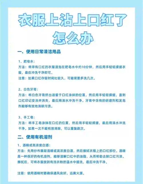 使用酒精去除口红印:首先,用一块纱布蘸取适量酒精,轻轻擦拭衣物上的口红痕迹。接着,将衣物放入含有洗衣粉的温水中搓洗,酒精能有效分解口红成分,从而将其彻底清除。 利用温和肥皂水清洗:将衣物浸泡在温和的肥皂水中约10分钟。