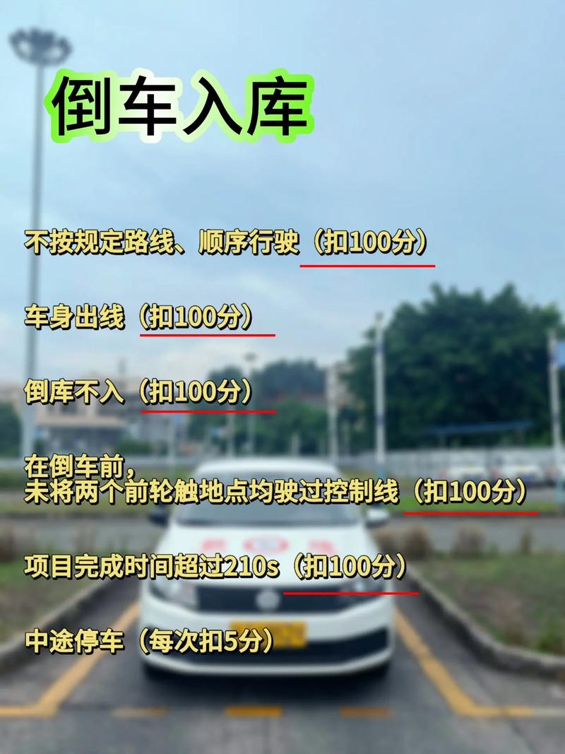 科目二倒车入库中途停车扣分规则 科目二倒车入库时,中途停车超过2秒,每次扣5分。具体扣分项目如下:倒车入库:车身出线或不按规定线路顺序行驶,不及格;倒库不入,不及格;中途停车超过2秒,每次扣5分;未在规定时间内完成考试,不及格;在倒车前,未将两个前轮触地点均超过控制线,不合格。