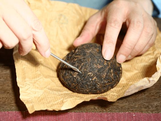 开普洱沱茶需要用巧劲。使用茶道开茶饼的使用应该使用撬动 而不是使劲扎入茶内部就行了,还要一边施力撬动,茶才容易松开。现在压制的饼茶、砖茶一般来说都不会太紧,拆开都不困难,注意不要扎到手。沱茶因其形状和 工艺的原因,有些会很结实,不易拆散,这时候更要注意一边施力一边撬动。