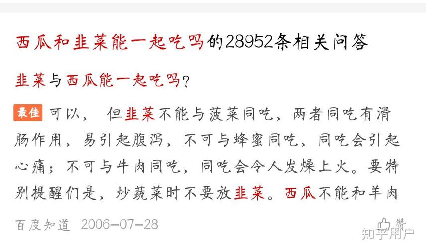 3、韭菜与西瓜能一起吃。以下是关于韭菜和西瓜食用的一些注意事项:韭菜的食用特性:韭菜味甘、辛,性温,无毒,具有健胃、提神、温暖的作用。其根、叶捣汁还有消炎止血、止痛的功效。但需要注意的是,韭菜与某些食物如菠菜、蜂蜜、牛肉等同吃时,可能会引起不适,如腹泻、心痛或上火等。