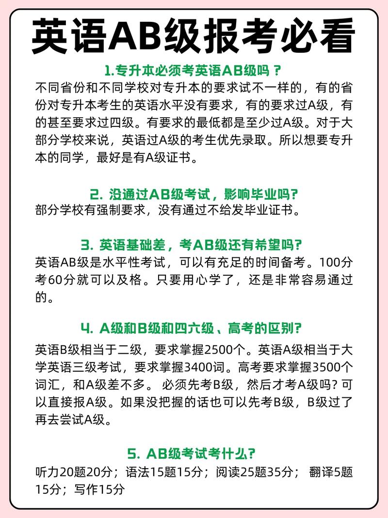 1、了解考试题型和分值 英语AB级考试包括听力理解、语法结构(或词汇和语法)、阅读理解、翻译(英译汉)和写作(或汉译英)五个部分。了解每个部分的分值和题型特点,有助于你针对性备考。听力理解:英语A级20分,B级24分。测试考生理解所听对话、会话和简单短文的能力。