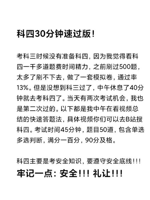 车管所考科四时间为45分钟。科目四考试一般包括选择题和判断题,考生需要通过答题来展示自己对道路交通安全法律法规的认知程度。一些常见的考试内容包括交通标志、信号、道路标线的含义和作用、交通事故处理程序、行车安全常识等。