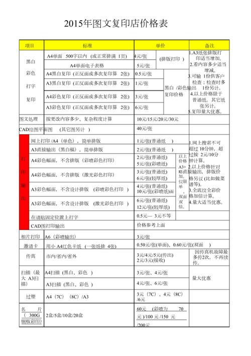 2、图文快印店的投资成本主要受市场定位和店铺规模影响,所在城市也会影响成本。常见的成本包括房租、装修、设备、材料、人工、水电、办公等费用。加盟还需考虑品牌加盟费。设备费用差异显著,如黑白打印机约2000-3000元,彩色打印机则需数万元。小型店铺如20-30平方米,雇佣一名员工,初步投入约5万元。