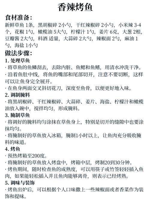 4、酸辣烤鱼的做法如下:腌制鱼:将草鱼从背部宰杀洗净。使用葱姜、花椒、白酒以及腌鱼料将鱼腌制20分钟左右,以便入味。准备配菜:将黄豆芽和白菜焯水,过凉后作为打底菜铺在烤盘底部。烤鱼:将腌制好的鱼放入烤箱中烤制至熟,具体烤制时间和温度根据烤箱性能和个人口味调整。烤好后取出,装盘备用。
