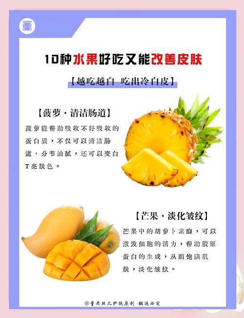 对皮肤有好处的水果主要有以下几种:猕猴桃:猕猴桃被誉为水果之王,含有丰富的维生素和微量元素,能够补充体内所需物质。具有抗黑色素生成的作用,有助于消斑,特别适合长斑的女性朋友。葡萄:葡萄具有延缓衰老和抗氧化的作用。葡萄籽也蕴含丰富的营养物质,建议连同葡萄籽一起吃,以达到最佳效果。