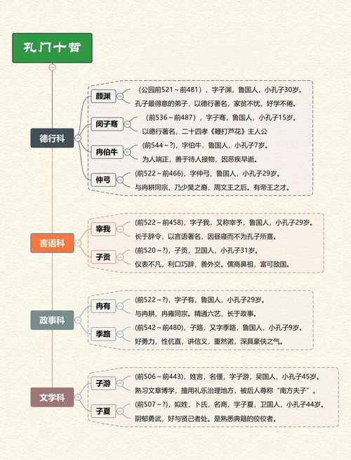 3、在先秦时期,孔门***的分类被学者们广泛讨论,其中一种说法认为孔门四科是“文、行、忠、信”四个方面,依据是《论语·述而》中记载的孔子四教内容。而另一种更为普遍的观点则将孔门四科定义为德行、政事、文学和言语四方面,其依据是《论语·先进》中对***们按其学业特长进行分类的记载。