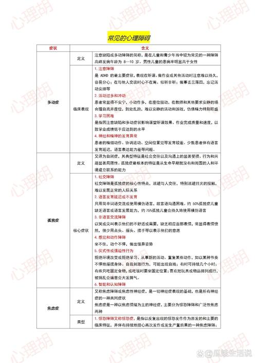 心理疾病种类繁多,根据不同的标准和严重程度,可以大致分为以下几个大类: 感觉、知觉和注意障碍:涉及患者对感官输入的处理,如注意力缺陷多动障碍(ADHD)和自闭症等。 记忆和思维障碍:如学习技能发育障碍、口吃和自闭症等,这些会影响儿童的思维发展。