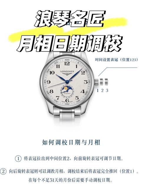 浪琴手表通常有两档按钮。将表把拔出一档,可以调整日期;将表把拔出二档,则可以调整时间。 要调整日期,需将表把拔出一档。1至31日,如果遇到只有30天的月份,需要手动跳过31号。请注意,日历通常在晚上的12点进行调整。如果在白天调整日历,需要手动将时间顺时针旋转12小时,即2小时。