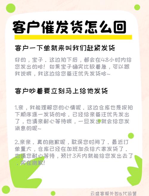 【客服参考回复】:(1)第一次催发货:亲亲不好意思,由于订单量比较多,我们按顺序发货所以慢了一点。这边给您备注,我们会在XX小时内尽快为您发货哦。(2)第二次催发货:亲亲不好意思让你久等了,这边已经给您备注优先发货了,我们会在xx小时内/今天尽快为您发货。