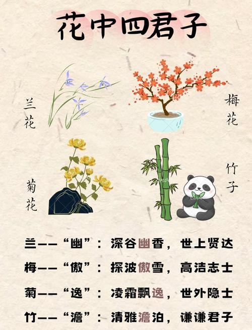 梅兰竹菊被尊称为“四君子”,这一称谓源于它们各自的自然特性,这些特性恰好符合古人对于高尚品格、道德修养和文化内涵的认同。 梅花、兰花、翠竹和菊花分别象征着高洁、清逸、气节和淡泊,这四种品质被视为中国传统文化的精髓。