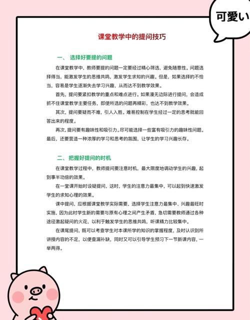 2、课堂提问的方式多种多样,其中四种常见的方法包括: 自问自答式提问:教师向全班学生提出问题后,稍作停顿,给予学生思考的空间,随后由自己揭示答案。这种方法有助于引导学生思考,并帮助他们理解问题的本质。 集体式提问:教师提问后,全班学生共同参与