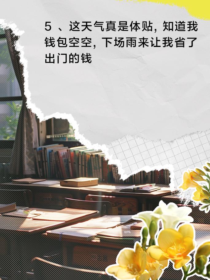 4、」这类回复需要对方熟悉网络流行梗,适合年轻群体; 自嘲解围型:「这雨下得比我钱包还空」用自黑化解尴尬,适用于同事或普通朋友; 诗意反转型:「此时应有BGM:冷冷的冰雨在脸上胡乱地拍」老歌热梗一网打尽; 吃货转化型:「走!火锅配暴雨才是绝杀」把天气劣势转为聚会契机。