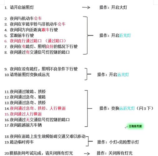 4、灯光考试科目三操作口诀如下:没有灯光开大灯,跟车会车用近光,有通过二字就远近光交替。科目三灯光考试口诀:夜间在没有路灯,照明不良条件下行驶;大灯。夜间在简姿窄路与非机动车会车;近光。夜间同方向近距离跟车行驶;近光。夜间与机动运握车会车;近光。
