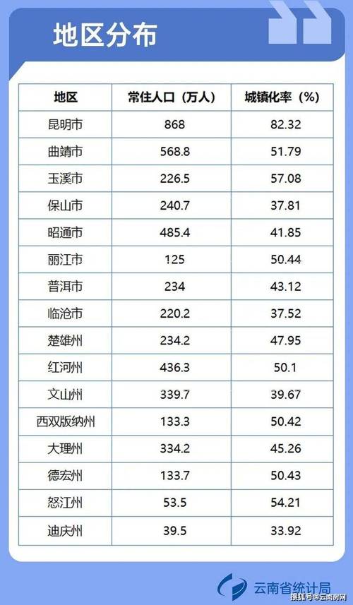 截至2023年末,云南省常住人口约为4673万人。这一数据在全国排名第十二位,位居西南地区第二。从城乡结构来看,城镇常住人口为2473万人,比2022年末增加了46万人,乡村常住人口则减少到2200万人,城镇化率达到了592%,较前一年提高了2个百分点。