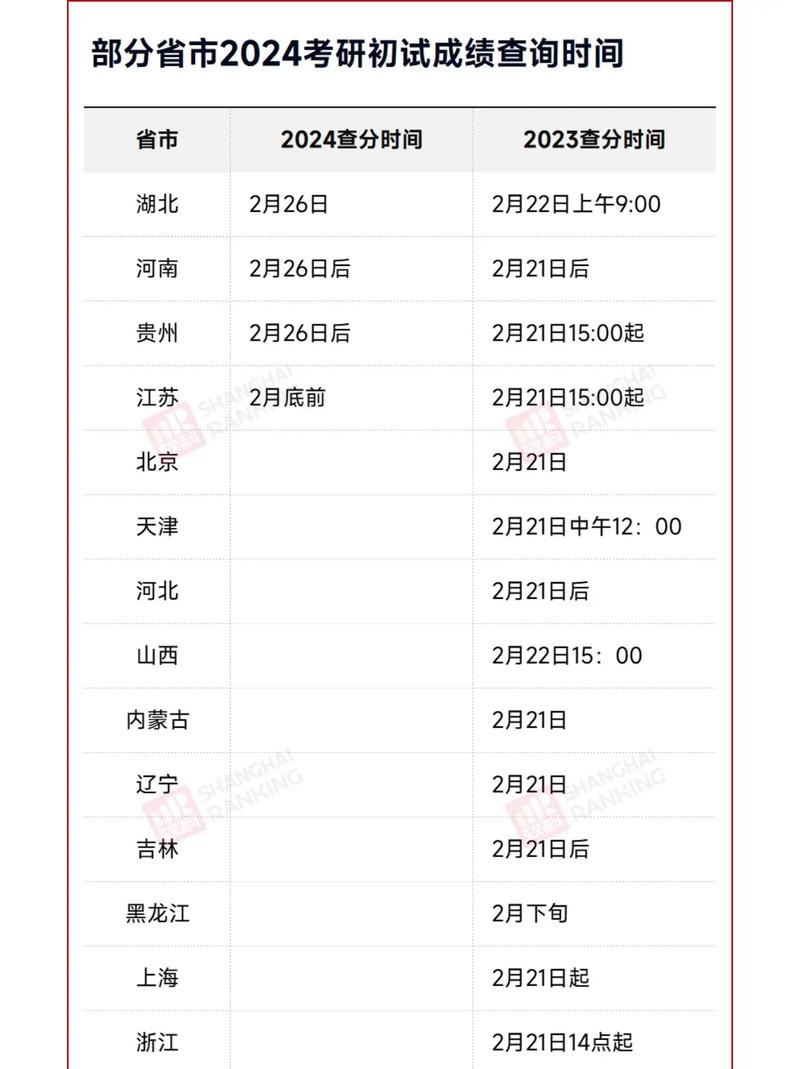 3、考研成绩不会全部公示,仅考生本人可通过学校研究生院网站的查询系统,输入个人信息查看成绩及是否进入复试。初试成绩通常在二月上旬到中旬公布,具体时间依据教育部当年发布为准。各个省份公布时间或存在一两天差异。