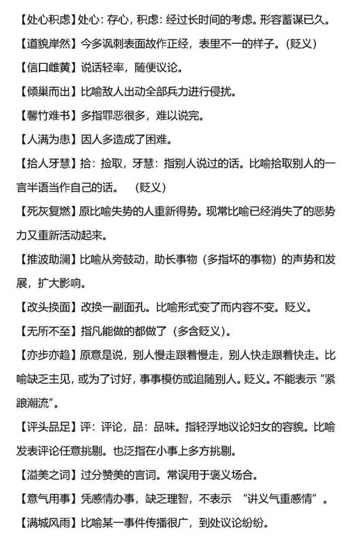 含褒义色彩的有:一丝不苟,视死如归,兴国安邦,完璧归赵。 含贬义色彩得有:盛气凌人,画蛇添足。 由两对相同(或相近)的词组成的有:兴国安邦。