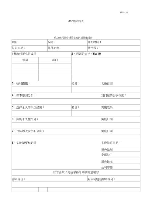 3、在撰写8D报告时,应详细描述问题的现象、根本原因、纠正措施和预防再发生的建议,同时注重数据的支持和逻辑的严密性。通过反复学习、实践和复盘,可以逐渐掌握8D报告的核心要义,并能够在遇到质量问题时迅速有效地运用8D方法来解决问题。