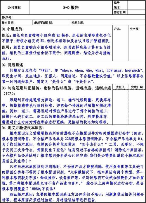 2、执行8D报告的关键步骤:D0:问题初步理解,即紧急响应措施,判断问题类型、规模与影响范围,决定是否采用8D方式解决。此步骤在多数情况下已口头传达,较少形成书面记录。D1:组建小组,成员应具备过程、产品知识、授权与所需技能,确保团队有效运作。