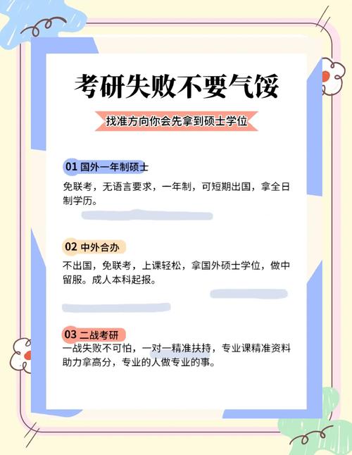 3、考研失败后的应对策略如下:继续考研,来年再战:找到失败原因:分析自己在考研中的不足之处,如知识点掌握不牢固、时间管理不当等,以便针对性地进行改进。调整心态与休息:不要急于立刻投入下一年的备考,适当休息一段时间,调整心情,确保以最佳状态迎接新的挑战。